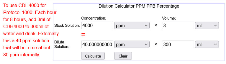 - If a person wants to use CDH4000 for Protocol 1000, (which is taking 3 activated drops of MMS every hour, 8 hours a day), all they need to do is replace the 3 drops of MMS with 3ml of CDH4000 in 300ml of water every hour for 8 hours a day. The reason 300ml of water is needed is to create a dilution that is not too irritating to the throat when it's drank. 3ml in 300ml of water will create a 40 ppm solution which is fairly tolerable. The rule of thumb is that for every 1ml of CDH4000 used, it should be combined in 100ml of water if consumed as a drink. This will keep the ppm at 40.