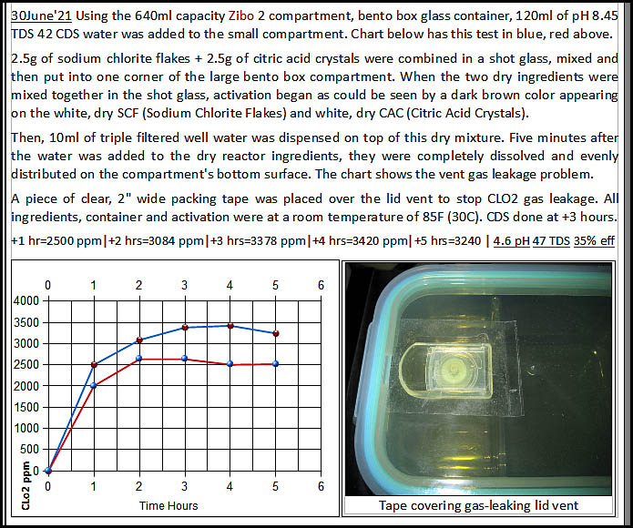 Hi Woofy. Always fun to try new ideas. Today I ran a similar test as before, but this time I put tape over the lid vent and it seemed to help reduce the loss of CLO2 gas. You can see the two tests in the chart. The blue line is today's test showing that CLO2 concentration continued upward compared to the previous test. More NaCLO2 flakes and CA crystals were used for today's test to get above 3000 ppm.