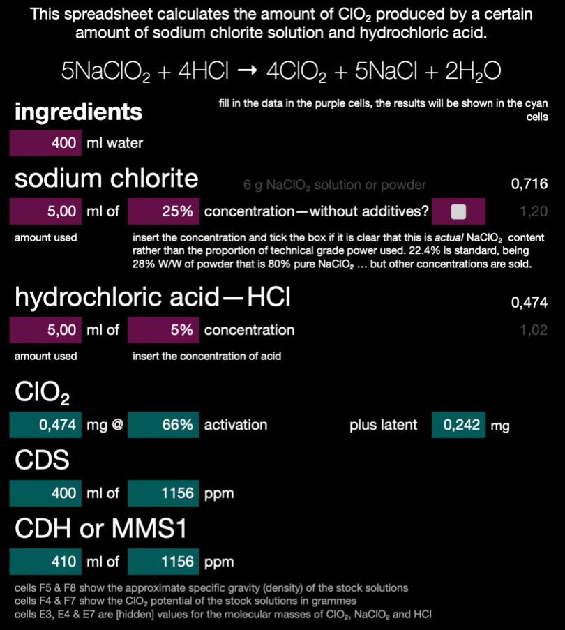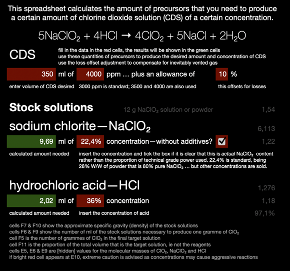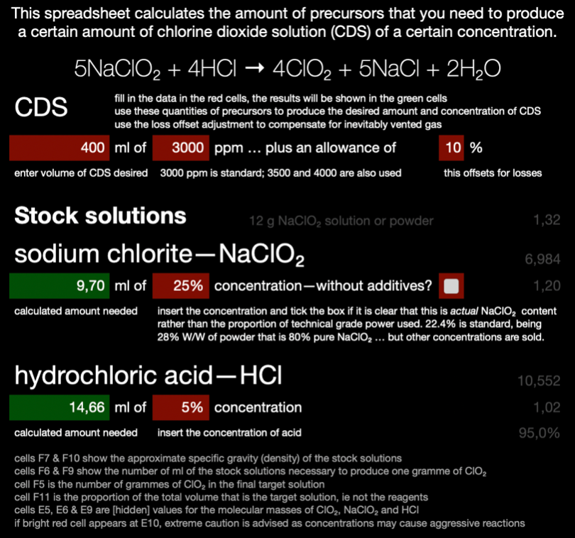 I have recently uploaded a calculator that allows you to use any strength of solution. Why pre-dilute the NaClO₂ or HCl when all that does is introduce more water into the reaction chamber, which will retain ClO₂ in solution in proportion to the water present? Simply plug in the concentration of your solutions, set the volume and concentration of the desired CDS and it will tell you how much of each component to use. You could even calculate the reaction using undissolved NaClO₂ although I do not know how wise that would be, particularly with concentrated acid.