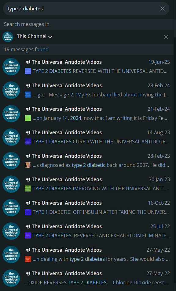 TUA Telegram channel with testimonialsYes, I see that, thank you. I'd like to ask: for type 2 diabetes that has required insulin dependence for many years, is there a validated effective treatment protocol using chlorine dioxide?