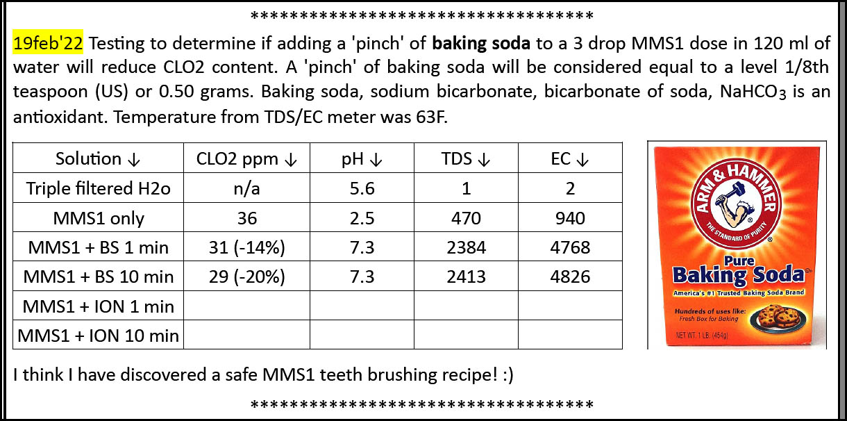 I don't think that's correct. CL02 is acidic and an oxidizer but baking soda is a base, alkaline. It is not an anti oxidant. I read this and tested my CDS which is around 4-5K ppm. It started out at ph 3.0 I added 4 drops of heavily saturated baking soda water that I use for brushing teeth (Now, thanks to this forum) to the 1 part CDS, 10 parts distilled water mix, (total 11 ml) and the ph went up to around 8.7. I checked the CL02 content of this 8.7 ph mix and if there was a CL02 change I can't see it. The colors are exactly the same on the CL02 test strips.