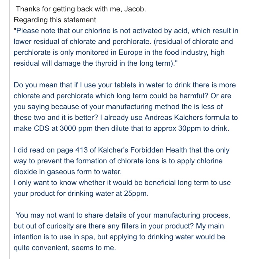 I'd watched the owner or CEO (Dan) interviewed by Mike Adams . . . and saw a 07/04/23 posting by stu77000 on this forum stating: . . . "Found the INGREDIENTS for their DISIN-CLO2 tablets on Youtube -- Sodium Chlorite, Magnesium Sulfate, Sodium Bisulfate, Sodium Sulfate. They also state this on Youtube: 'Main ingredients are Sodium Chlorite and Sodium Bisulfate. Our chlorine dioxide is not activated with acid due to residual concerns. For human and animal consumption, it has to be diluted to reach about 0.5 to 10 PPM or up to 30 PPM depending on the protocols.'"