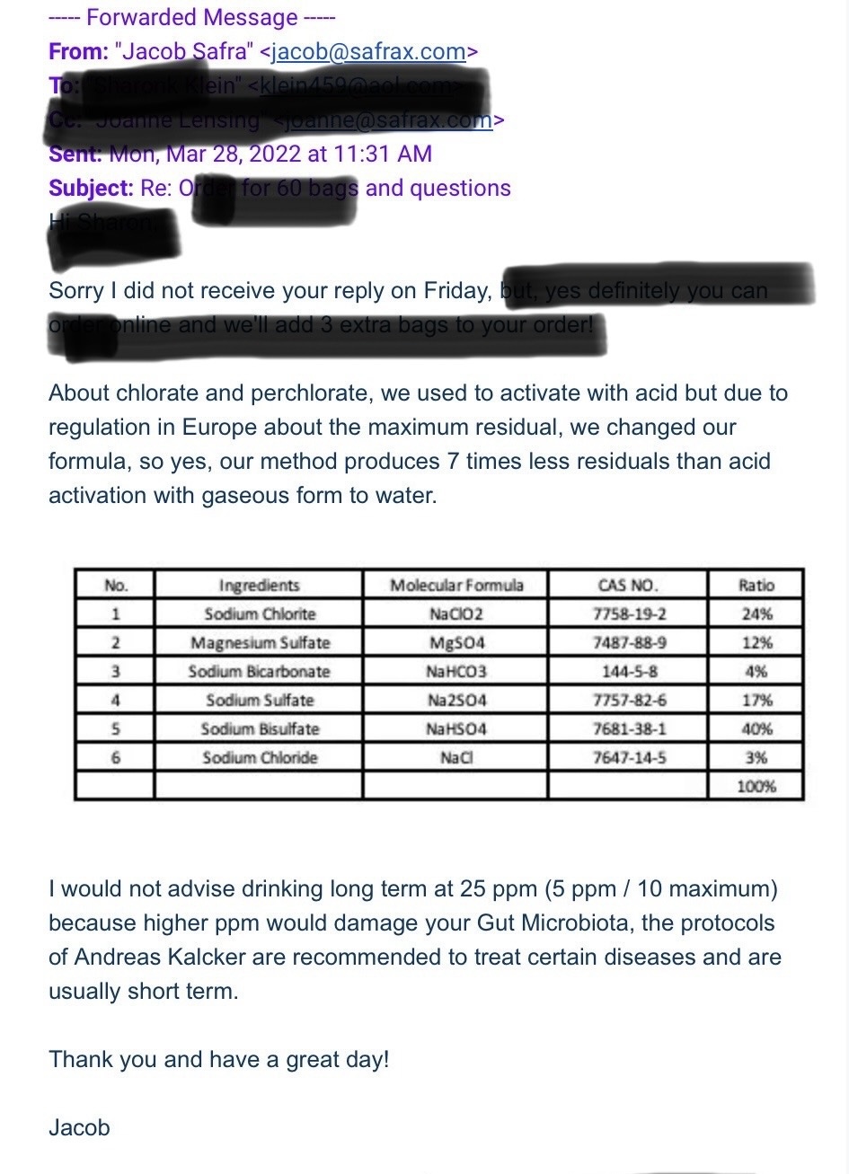 Thought I'd do some simple calculations. Each Safrax tablet is +/- 1 gm. 30 tablets mixed with a liter of distilled water produces 3000 ppm CDS solution. I take 80 ml. mixed with a liter of distilled water daily. That means I consume the liter of 3000 ppm CDS every 12.5 days. Extrapolating the percentages consumed of each ingredient over that 12.5 day period produces the following calculations:Sodium Chlorite: 24% x 30 gm/100 = 7.2 gm/12.5 days = 576 mg/dayMagnesium Sulfate: 12% of 30 gm/100 = 3.6 gm/12.5 days = 288 mg/daySodium Bicarbonate: 4% of 30 gm/100 = 1.2 gm/12.5 days = 96 mg/daySodium Sulfate: 17% of 30 gm/100 = 5.1 gm/12.5 days = 408 mg/daySodium Bisulfate: 40% of 30 gm/100 = 12 gm/12.5 days = 960 mg/daySodium Chloride: 3% of 30 gm/100 = 0.9 gm/12.5 days = 72 mg/day(1 gm. Divided by 12.5 days = 80 mg. per day):Sodium Chlorite: 7.2 gm/12.5 days = 576 mg/dayMagnesium Sulfate: 3.6 g/12.5 days = 288 mg/daySodium Bicarbonate: 1.2 gm/12.5 days = 96 mg/daySodium Sulfate: 5.1 gm/12.5 days = 408 mg/daySodium Bisulfate: 12 gm/12.5 days = 960 mg/daySodium Chloride: 0.9 gm/12.5 days = 72 mg/day