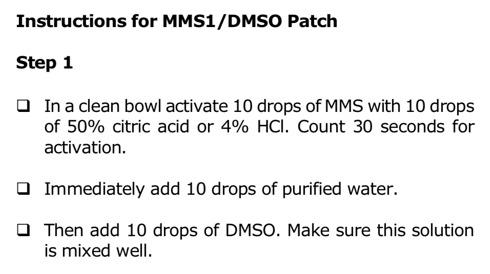 From Jim's book I mixed activated MMS and water, then mix DMSO and pour it to cotton gauze.