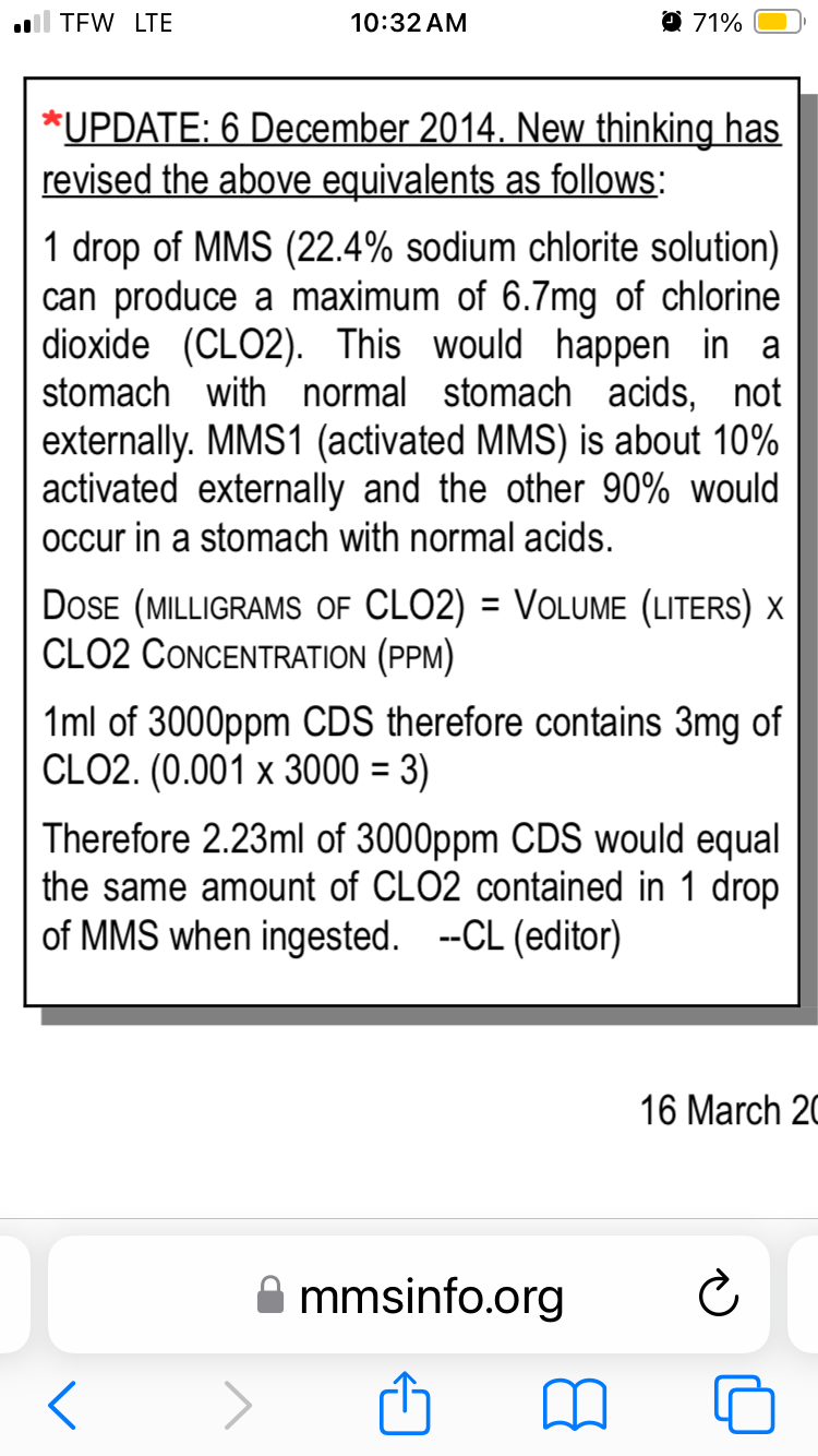 My thinking has changed and now I would not attempt to try to equate CDS and MMS1 dosing. The problem is we don't know how much more CLO2 will be released from residual sodium chlorite solution in MMS1, with stomach acid. You may know that at 30 seconds of activation time, only 10% of available CLO2 from SCS in MMS1 is released.