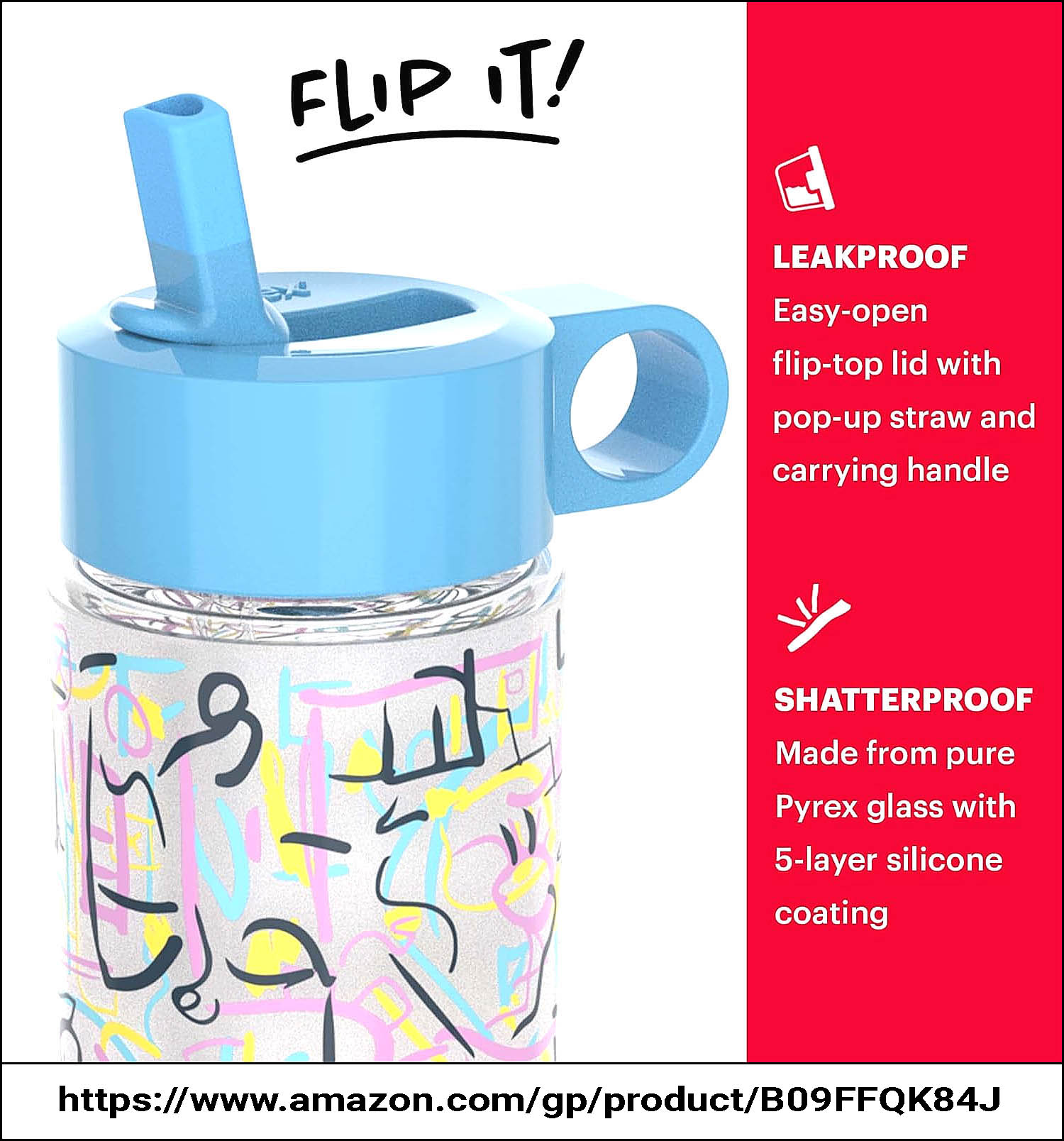 The black cover keeps UV light away from the glass bottle. This series of Pyrex water bottles goes on sale from time-to-time on Amazon.