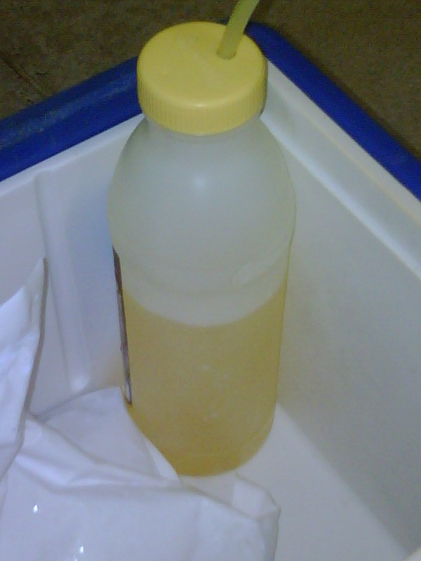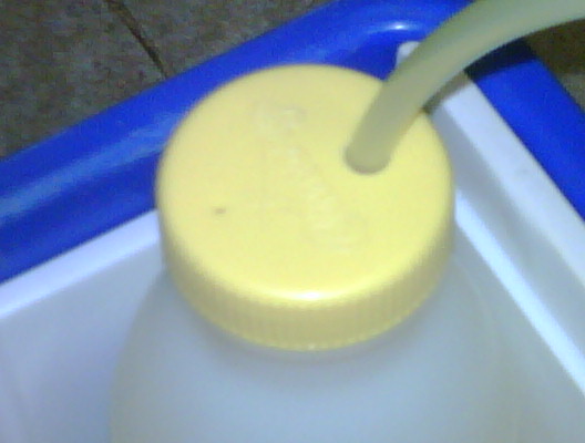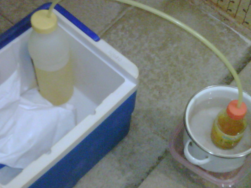 Here are the pictures of my setup. You'll notice I'm not using rubber stoppers but plastic screw-on caps. I have a drill press and so am able to create near perfect holes which I made just big enough to barely squeeze the plastic tubing through. I then did a pressure check with my mouth to make sure I had a good seal. On the receiving bottle I just poked a hole to allow the pressure to be released and also wasn't concerned about the tight fit of the tubing. My reaction bottle is small glass bottle (about 180 ml capacity, they sell a vitamin C drink in it here) and my receiving bottle is HDPE plastic - it's actually a milk bottle. Another thing I did differently is that I made sure my water was cold first and then just put it into an ice box and put ice packs around it instead of using ice water. For me the process took 35 minutes but that's because I kept stirring the reaction bottle mixture by swirling it occasionally. I noticed that whenever I did this, the bubbles came out much faster - until the swirling stopped - so I kept doing it until even that seemed to slow quite a bit. I used 50 ml mms plus 50 ml 50% citric acid solution.