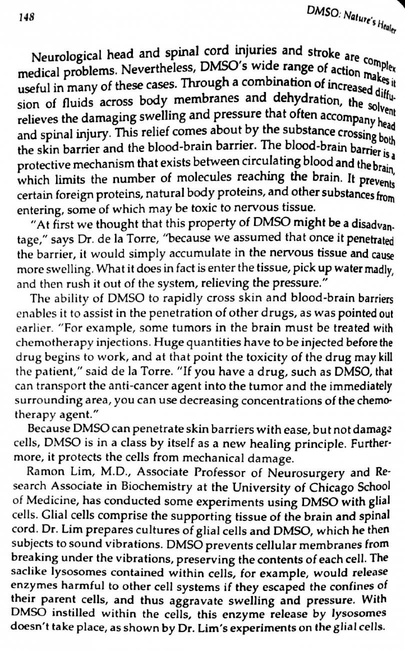 DMSO easily crosses the blood brain barrier and helps in healing. It might be able to carry one of the MMS's into the brain. Here are a couple pages out of DMSO: Natures Healer on the topic: