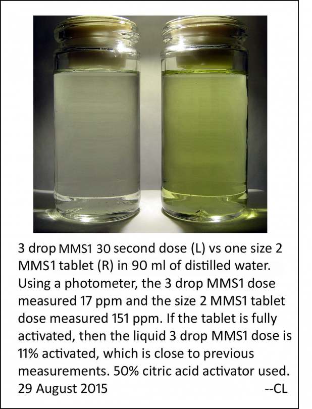 Here is a photo and test data of a MMS1 3 drop liquid dose compared to a single MMS1 type 2 tablet dose, both in 90 ml of distilled water. You can see that there is not much CLO2 in the MMS1 3 drop liquid dose. It was activated 30 seconds with 50% citric acid. The remaining MMS should be activated in a stomach with normal amounts of gastric acids.