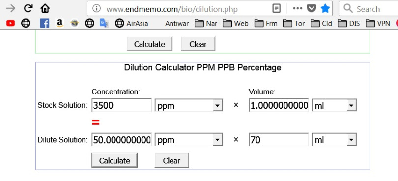 1. b. For dilution go here: www.endmemo.com/bio/dilution.php (Go to the last calculator on the page: The "Dilution Calculator PPM PPB Percentage" Following is an example for making 70 ml of 100 ppm dilute CDH (by the way I've used both purified water and IV solution and both felt the same going in but if you can get it, 0.9% Sodium Chloride IV solution would be best)