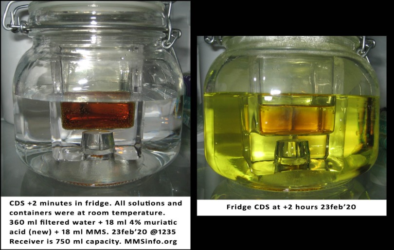 CDS is only CLO2 gas in a water solution and can be made by outgassing CLO2 from a MMS+acid reaction into distilled water inside a receiver container. The photos below show CDS being made using the 'shot glass/overnight' method and takes 12 to 48 hours to complete.