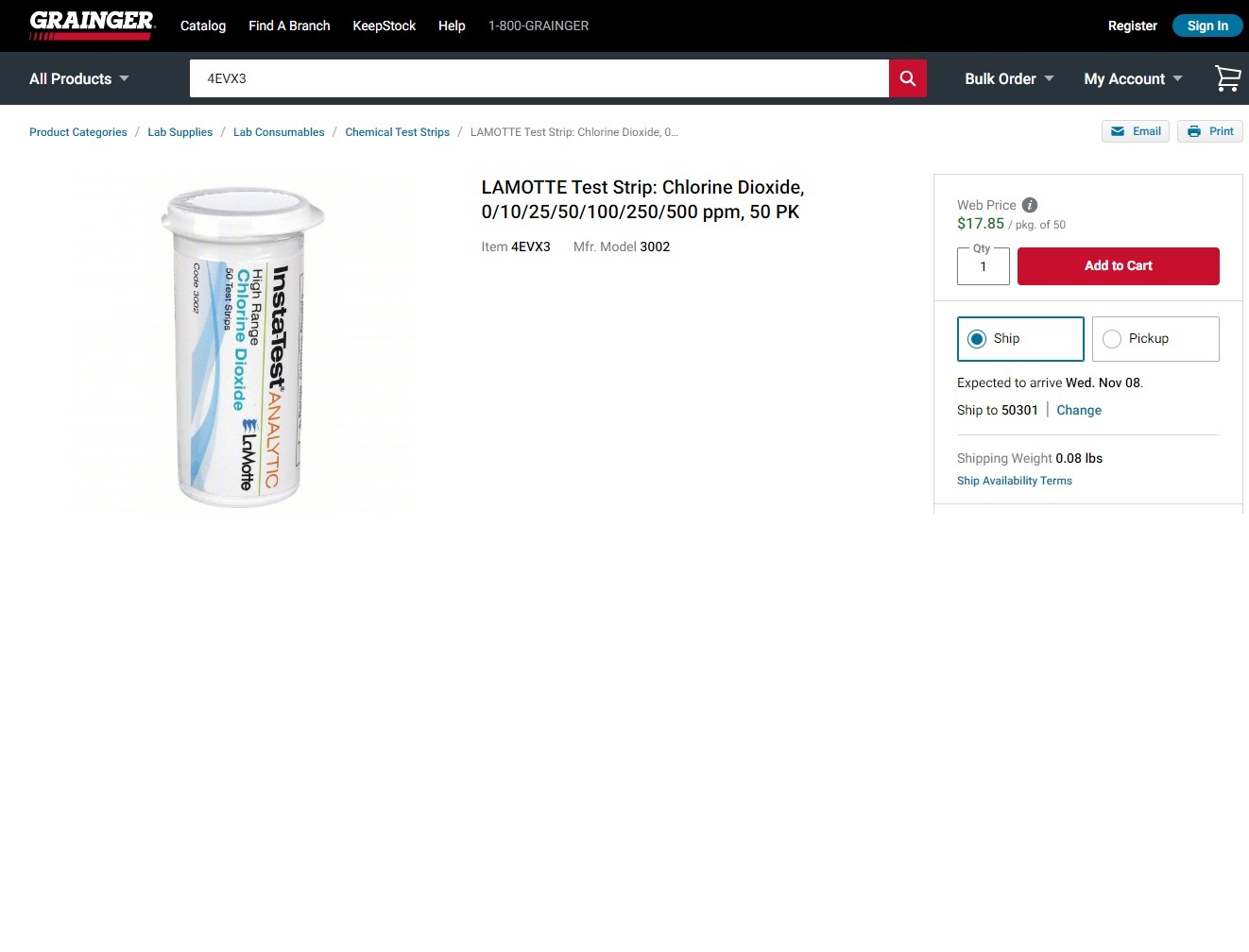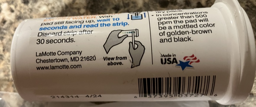 On 10/27/2023, I ordered LaMotte's InstaTest Analytic High Range Chlorine Dioxide test strips, 50 to a pack, from Grainger