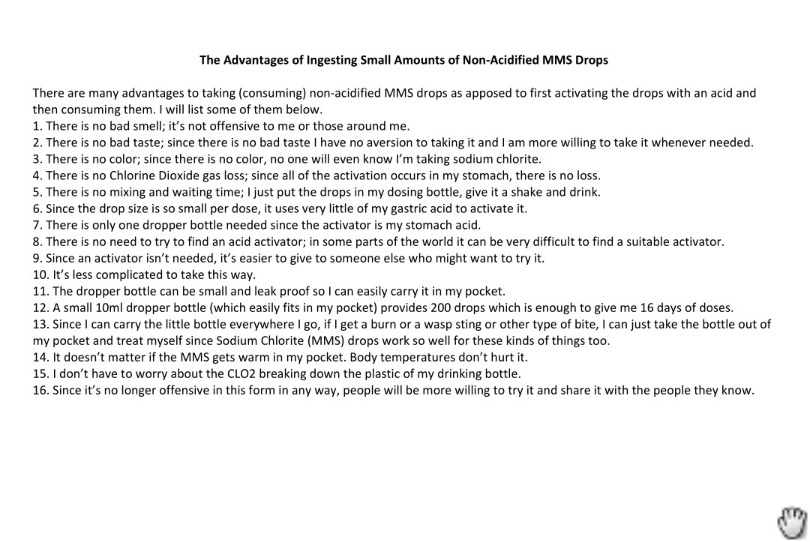 I decided to try your unactivated MMS in all my water, using 6 drops per 16 oz. of water all day long. After a few weeks, I stopped my CDH maintenance doses for 3 weeks, but my arthritis symptoms returned.