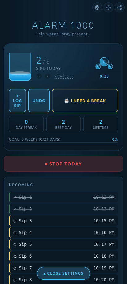 Forget complicated apps, subscriptions, and endless notifications. Alarm1000 is a clean, open-source hydration reminder that does one thing perfectly: it helps you drink water regularly.