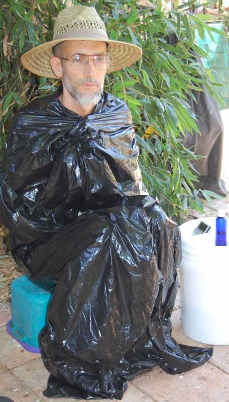 I bought a box of 20 bags that are 39 gallon bags from Home Depot that were on sale for $3.50. Take two bags and open one along the bottom seem. Slip that opened bottom seem bag about one inch inside the mouth of the other bag and then run packing tape all around the seem. That is all you do and you are ready. I am 6'1" about 150 lbs and I fit into it pretty well. You have to put your feet in then have a stool behind you, sit on it, then mix the MMS in a small bowl and immediately set it in by your feet and pull the bag up around your neck tight and have a timer and sit there.