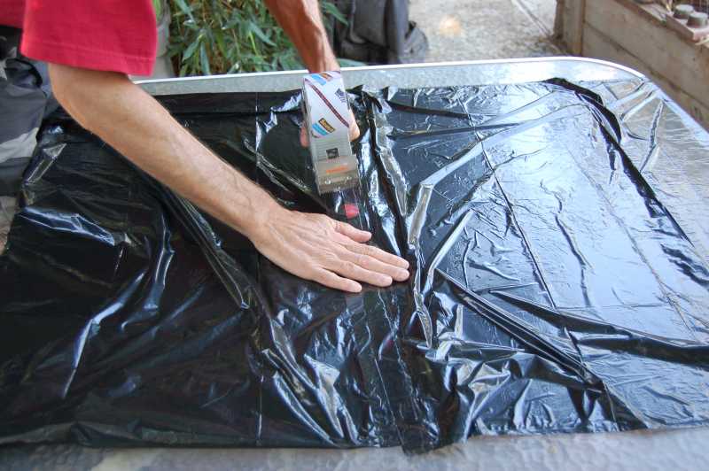 Get two large trash bags and tape their openings together. I have found these trash bags in various supermarkets around the world. They are all about the same size. It's the largest trash bag all the markets sell. Lay two of the bags on the floor with the openings against one another. Tape the bags together with no open places. Turn the bags over and tape both sides to make sure the gas will not get out. Cut the opposite end out of one of the bags and now you have one large bag at least 6 feet tall or taller.