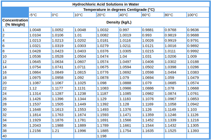 Look up the weight of your HCL concentration "Hydrochloric Acid Solutions in Water" in the chart at